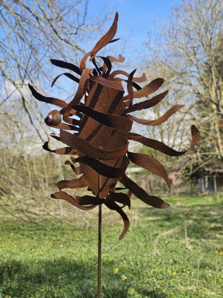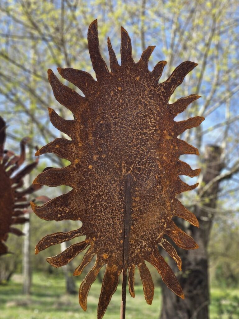 0,8 mm rustent pladejern, 16 mm rustent rundjern. 2 x jernsokler. Skåret med plasmaskærer og svejset med CO2 svejser på værkstedet.